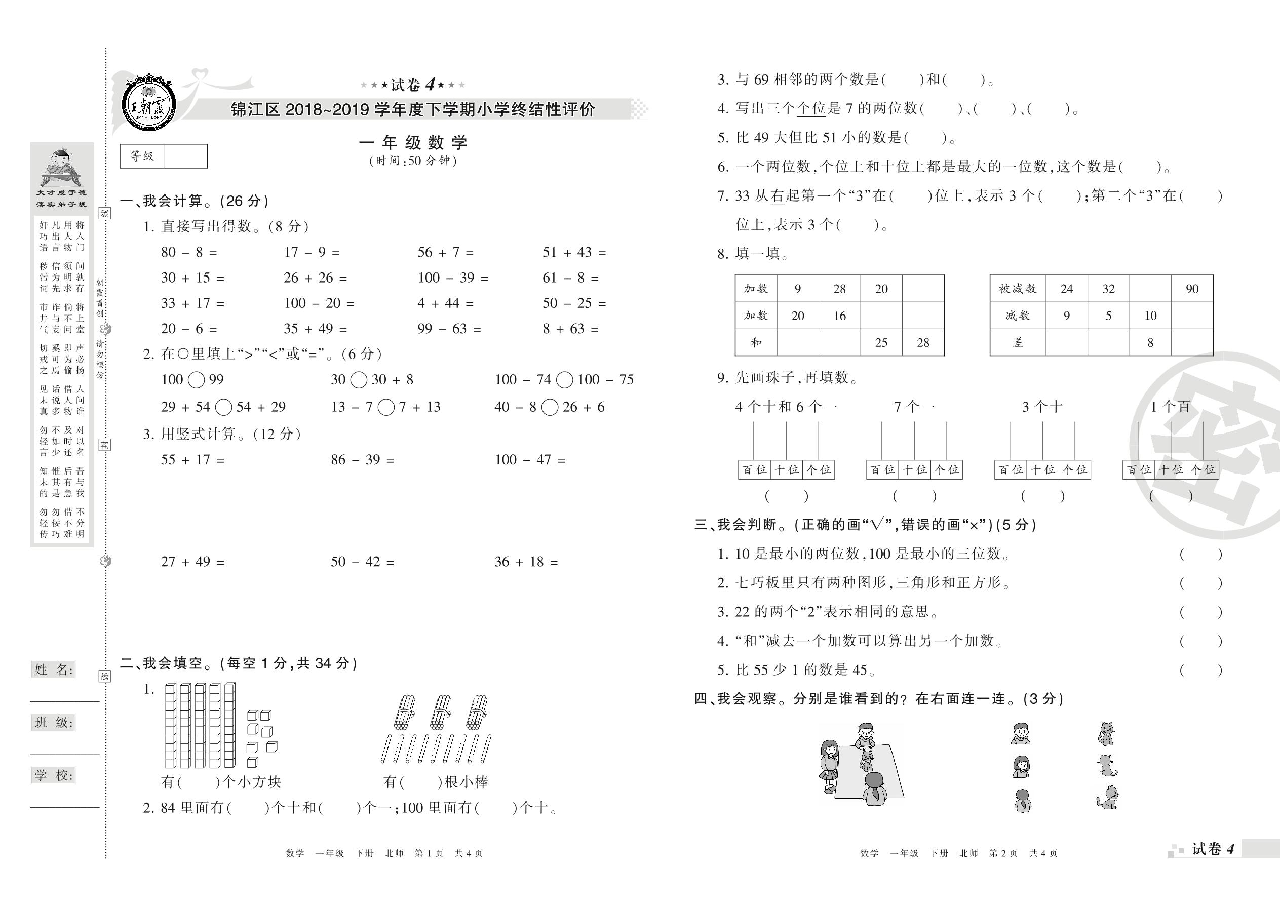 2018-2019学年第二学期成都市锦江区一年级数学试卷(北师版)【4】
