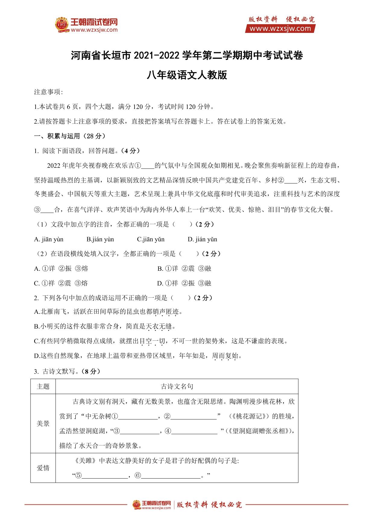 河南省长垣市2021-2022学年第二学期期中考试试卷八年级语文(人教版)