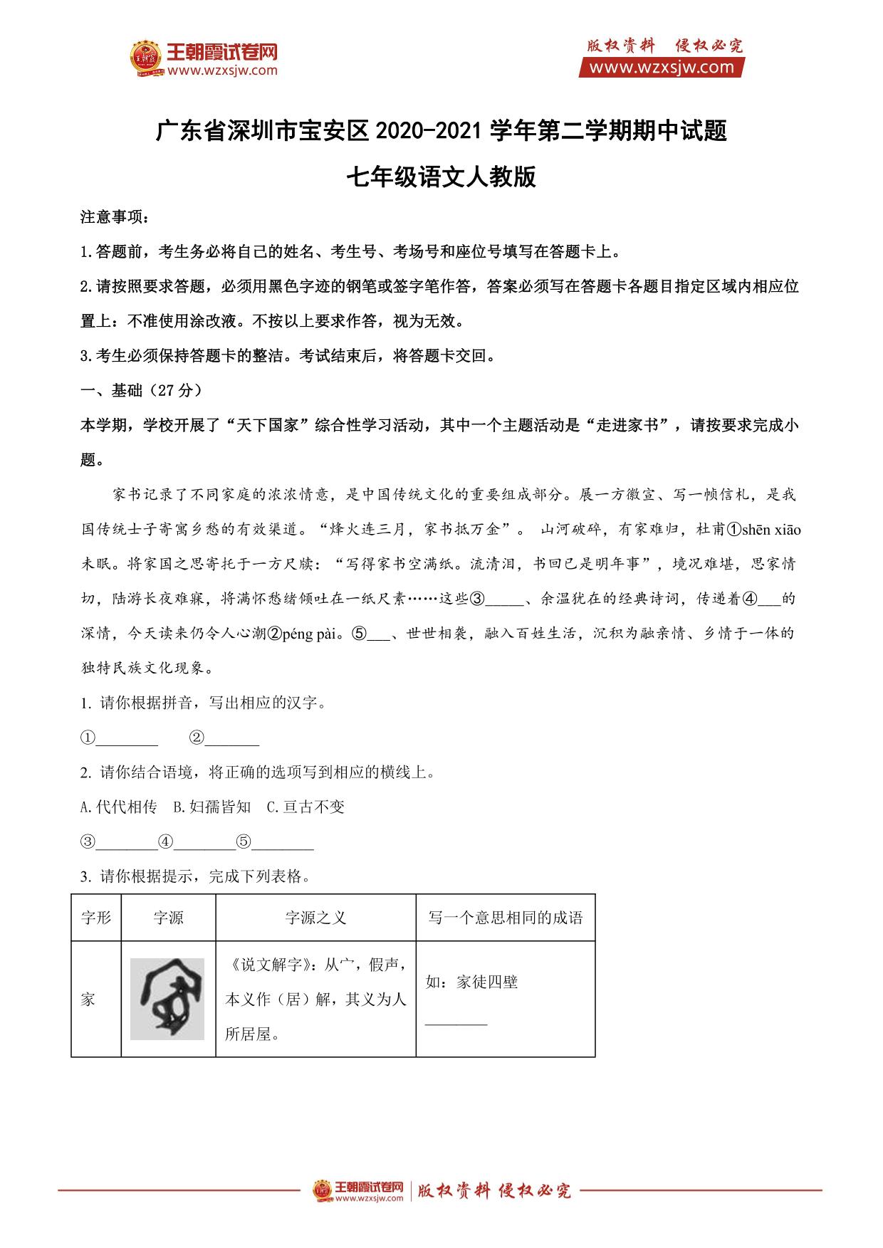 广东省深圳市宝安区2020-2021学年第二学期期中试题七年级语文(人教版)