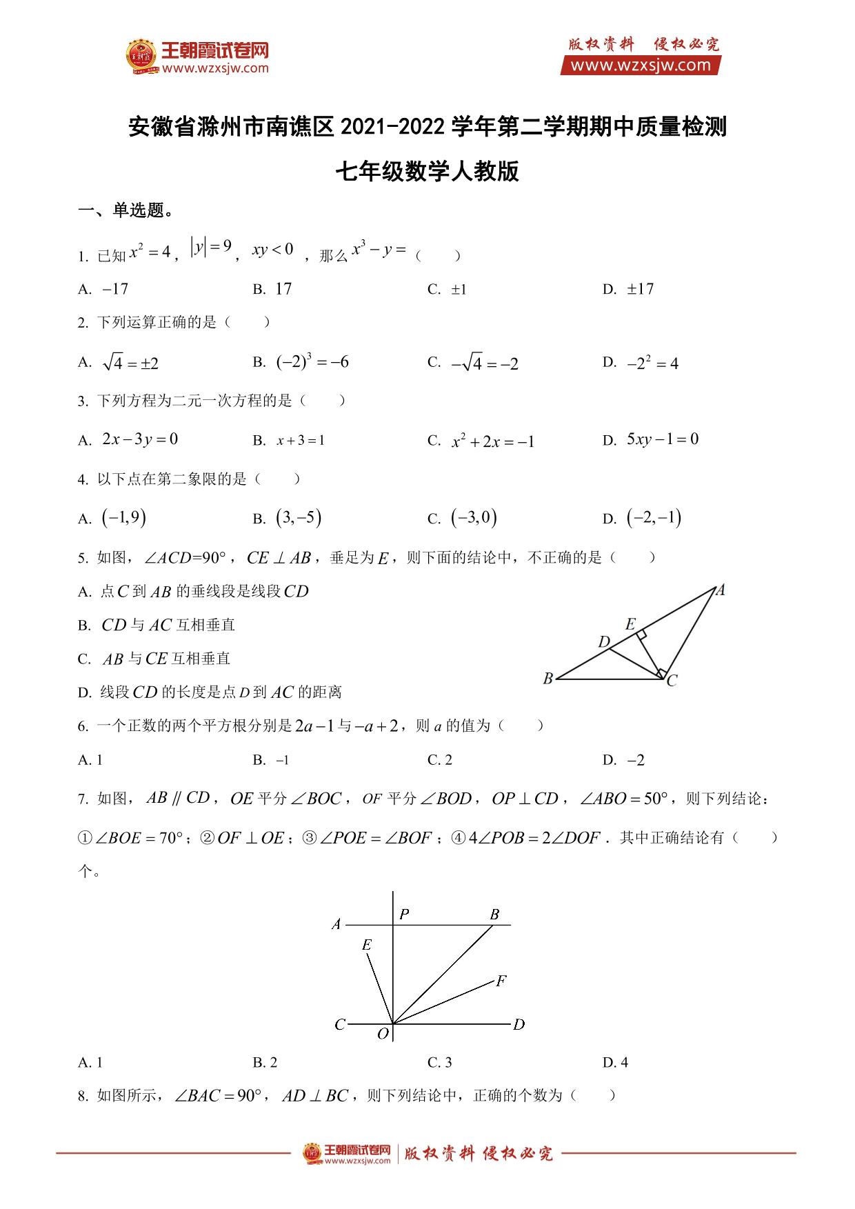 安徽省滁州市南谯区2021-2022学年第二学期期中质量检测七年级数学(人教版)