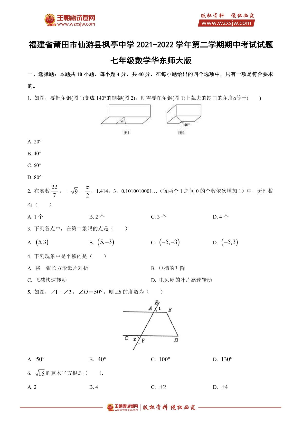 福建省莆田市仙游县枫亭中学2021-2022学年第二学期期中考试试题七年级数学(华师版)