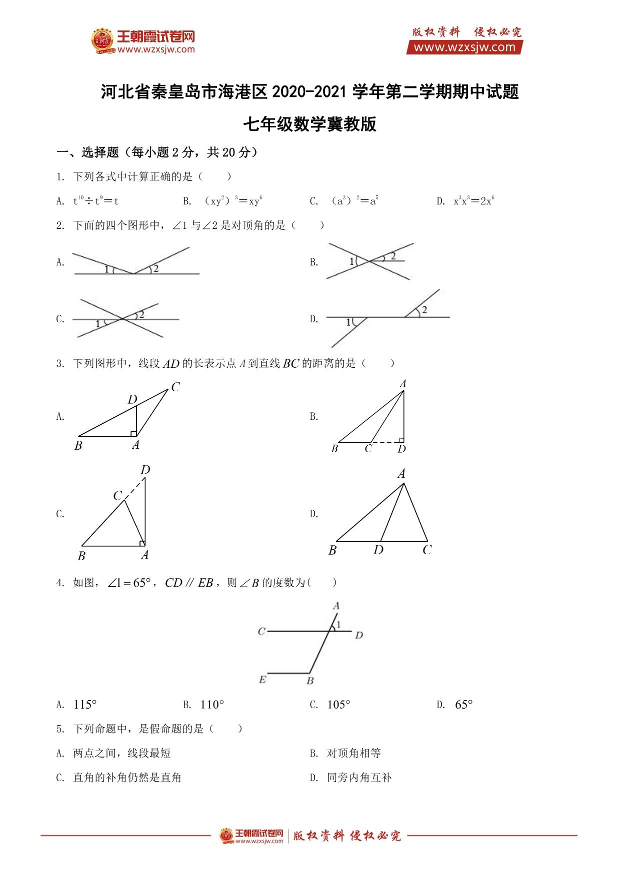 河北省秦皇岛市海港区2020-2021学年第二学期期中试题七年级数学(冀教版)