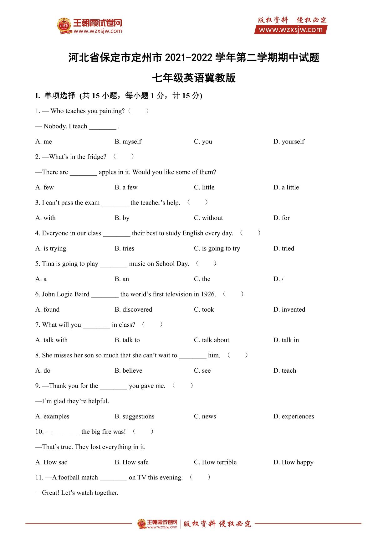 河北省保定市定州市2021-2022学年第二学期期中试题七年级英语(冀教版)【无听力音频】