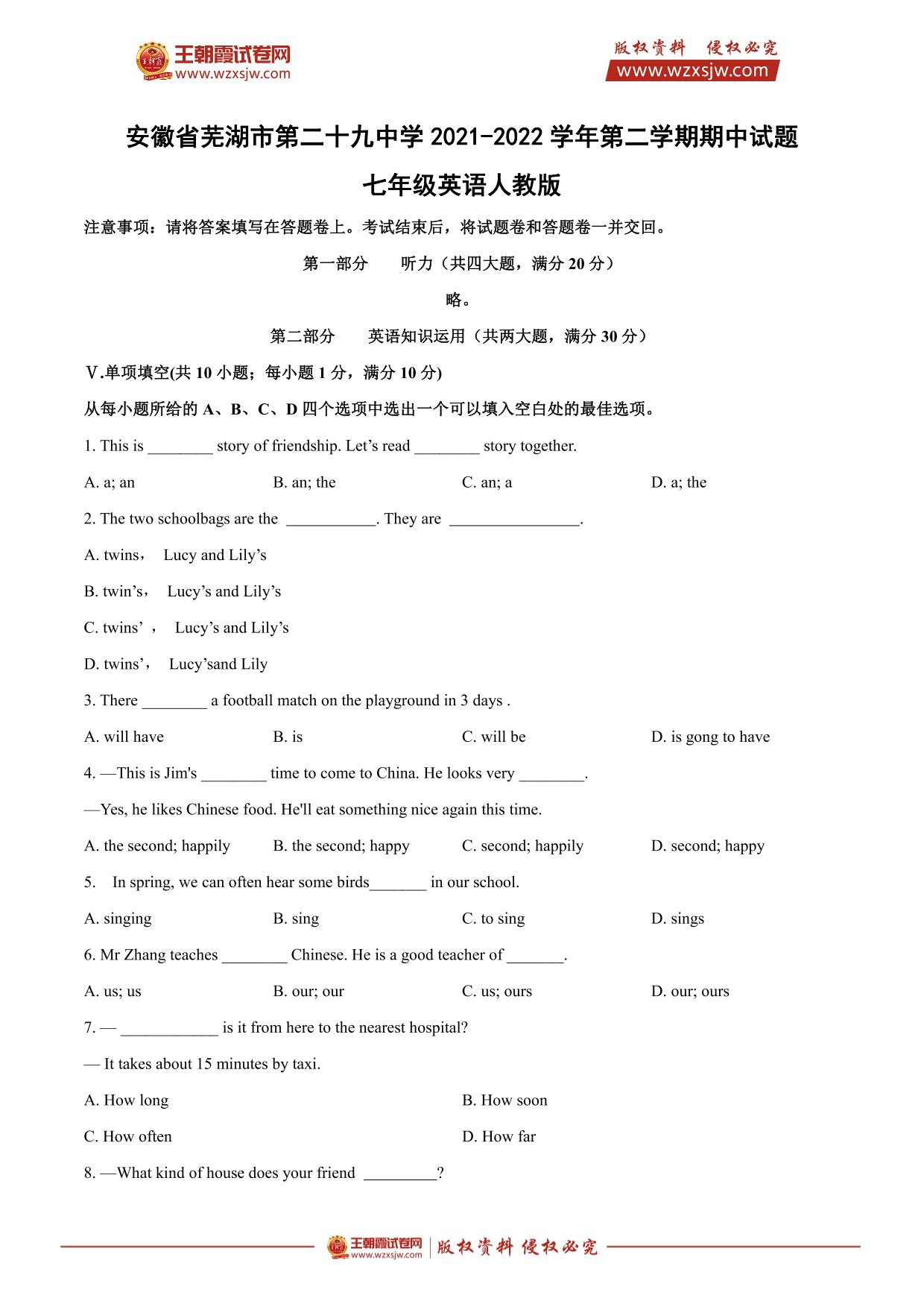 安徽省芜湖市第二十九中学2021-2022学年第二学期期中试题七年级英语(人教版)【无听力音频】
