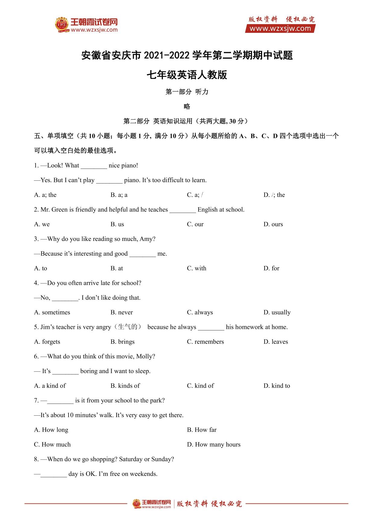 安徽省安庆市2021-2022学年第二学期期中试题七年级英语(人教版)【无听力音频】