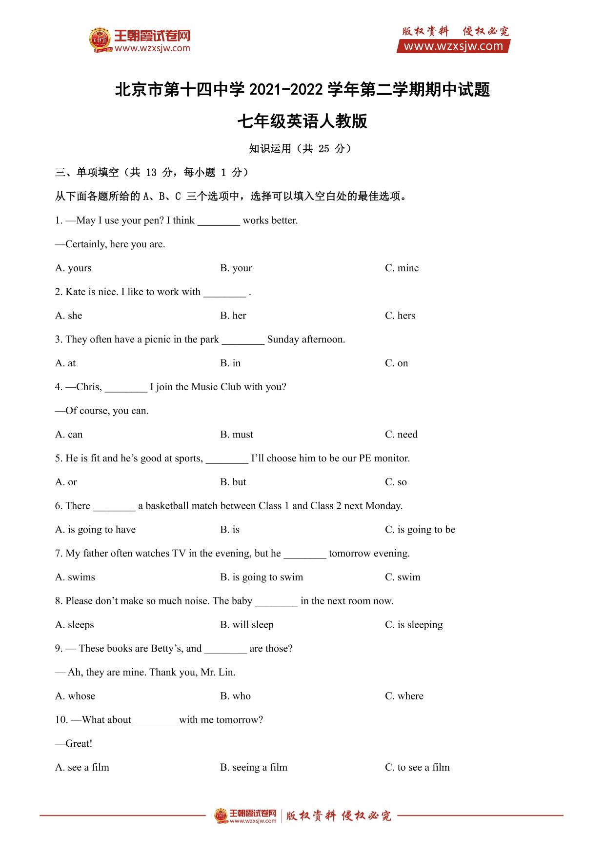 北京市第十四中学2021-2022学年第二学期期中试题七年级英语(人教版)【无听力音频】