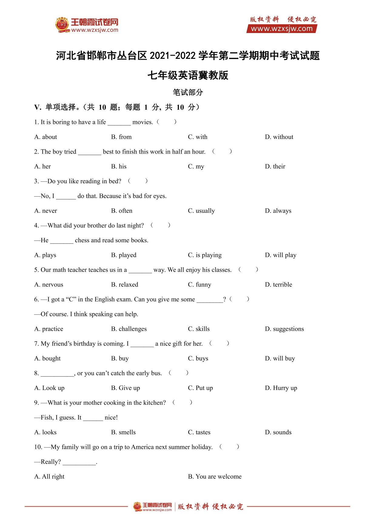 河北省邯郸市丛台区2021-2022学年第二学期期中考试试题七年级英语(冀教版)【无听力音频】