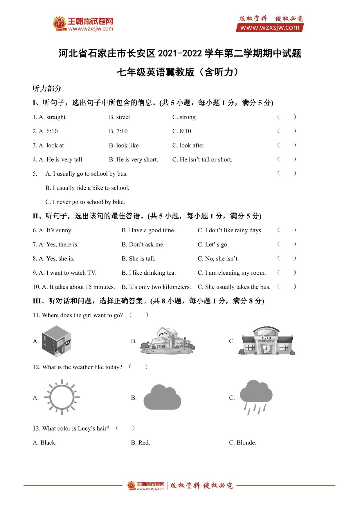 河北省石家庄市长安区2021-2022学年第二学期期中试题七年级英语(冀教版)(含听力)【无听力音频】