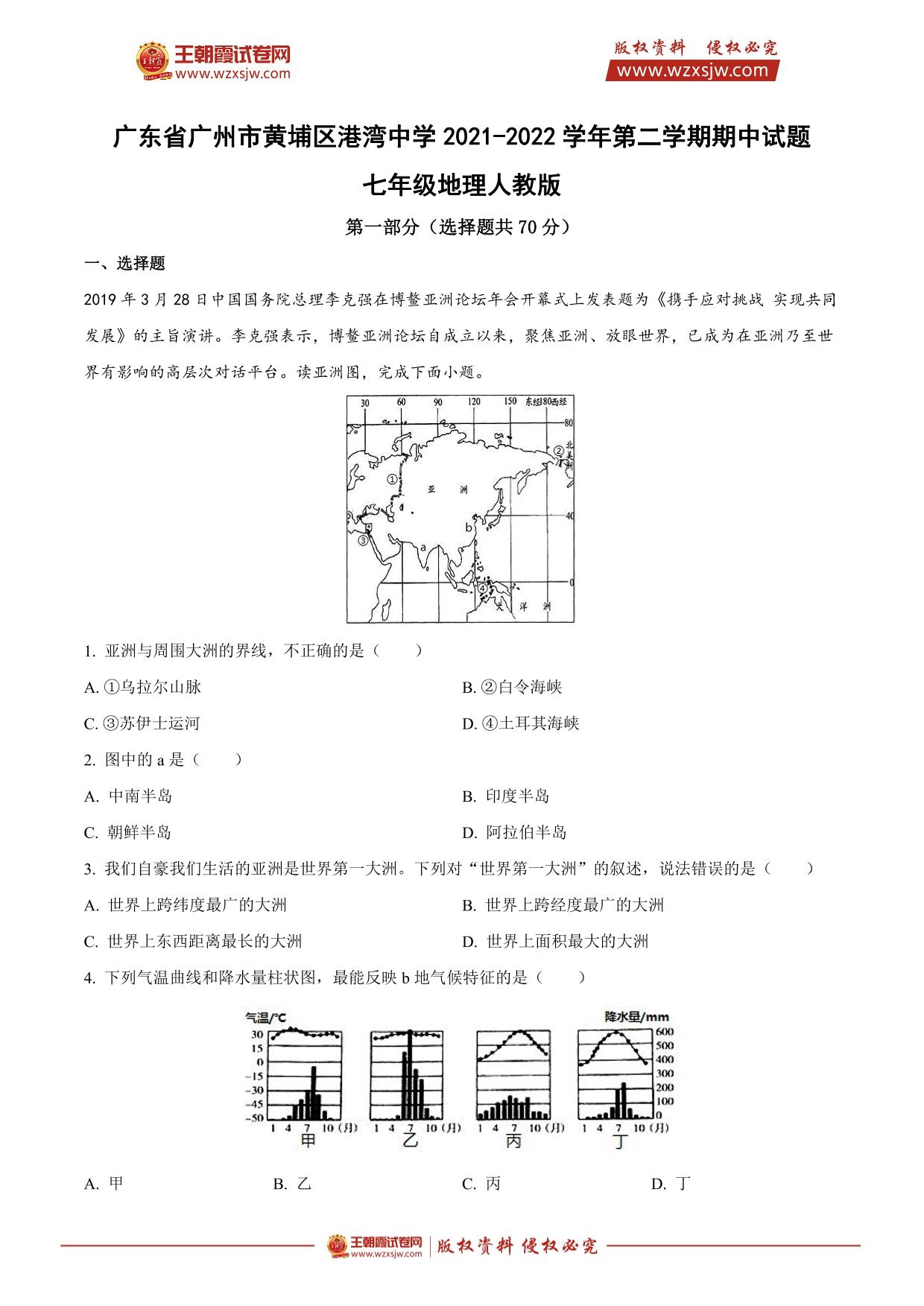 广东省广州市黄埔区港湾中学2021-2022学年第二学期期中试题七年级地理(人教版)