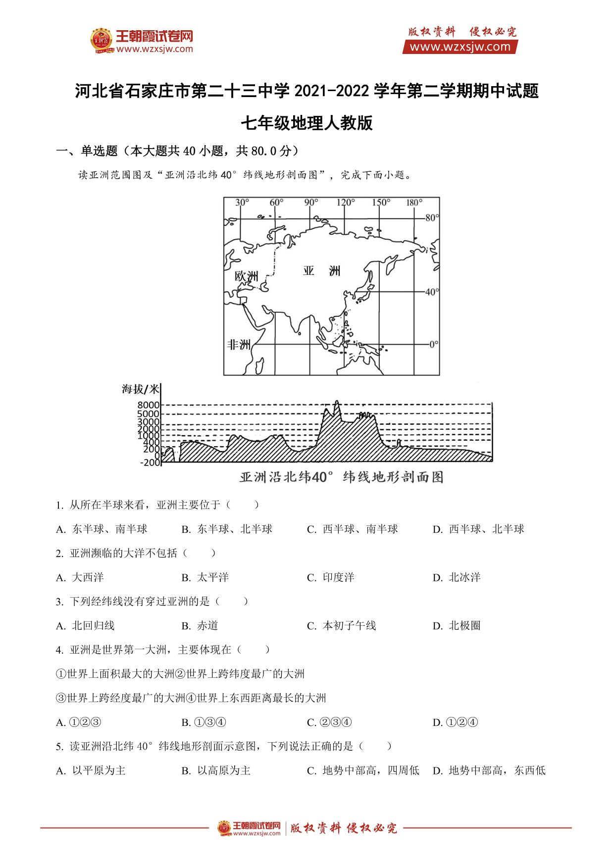 河北省石家庄市第二十三中学2021-2022学年第二学期期中试题七年级地理(人教版)