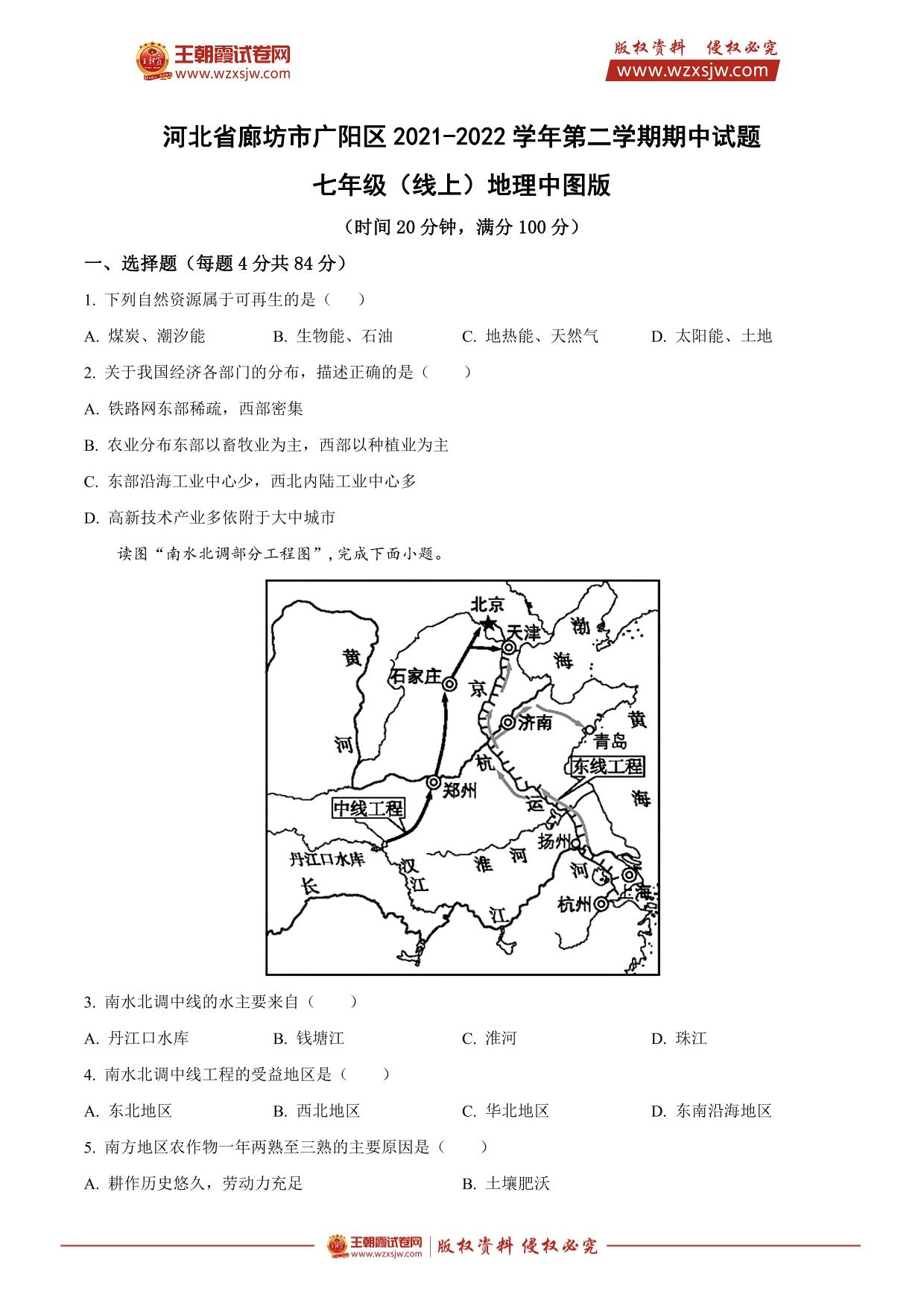 河北省廊坊市广阳区2021-2022学年第二学期期中试题七年级(线上)地理(中图版)