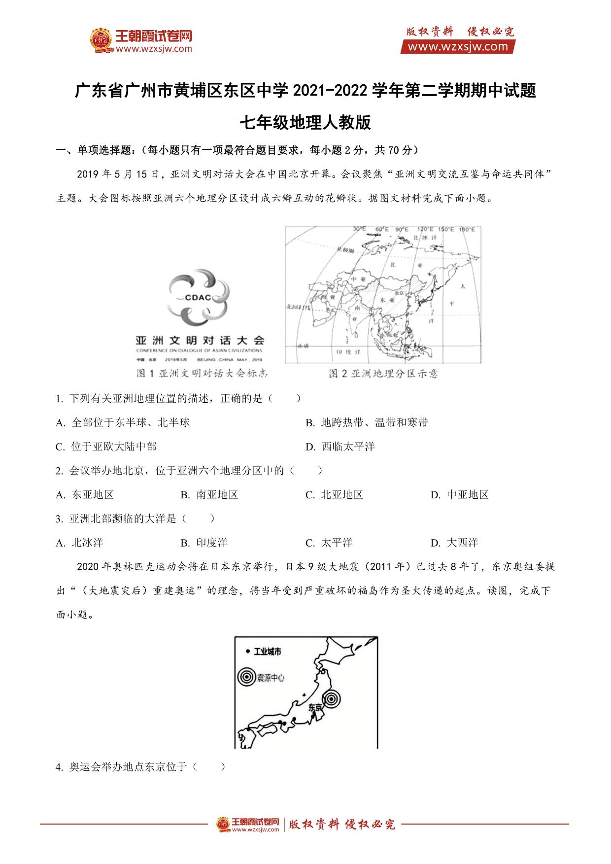 广东省广州市黄埔区东区中学2021-2022学年第二学期期中试题七年级地理(人教版)