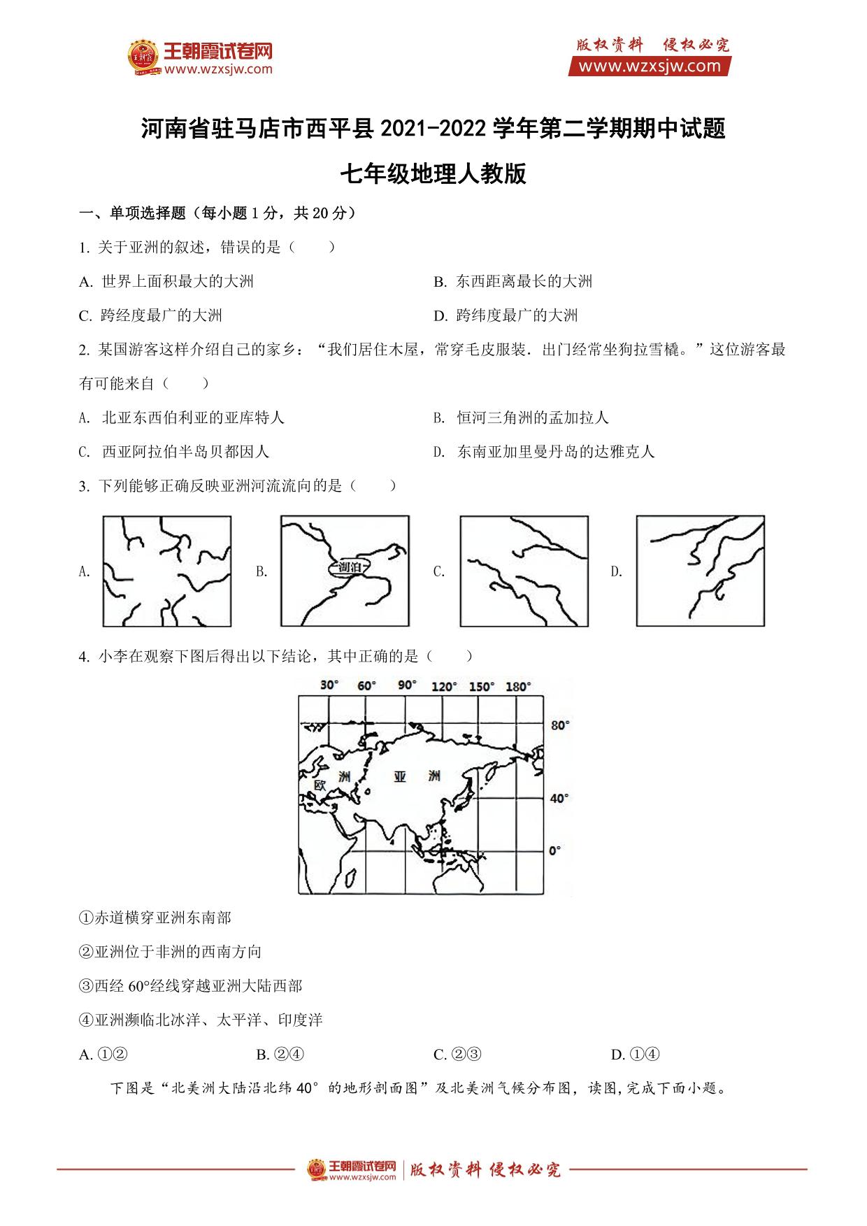 河南省驻马店市西平县2021-2022学年第二学期期中试题七年级地理(人教版)