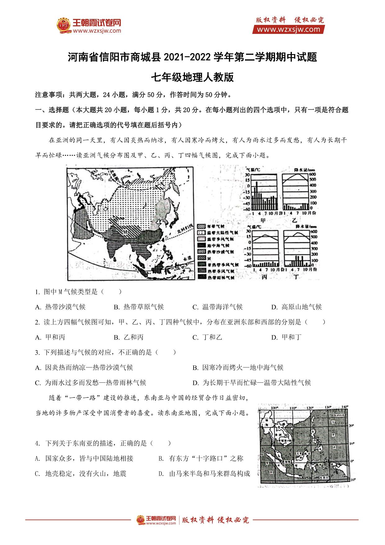 河南省信阳市商城县2021-2022学年第二学期期中试题七年级地理(人教版)