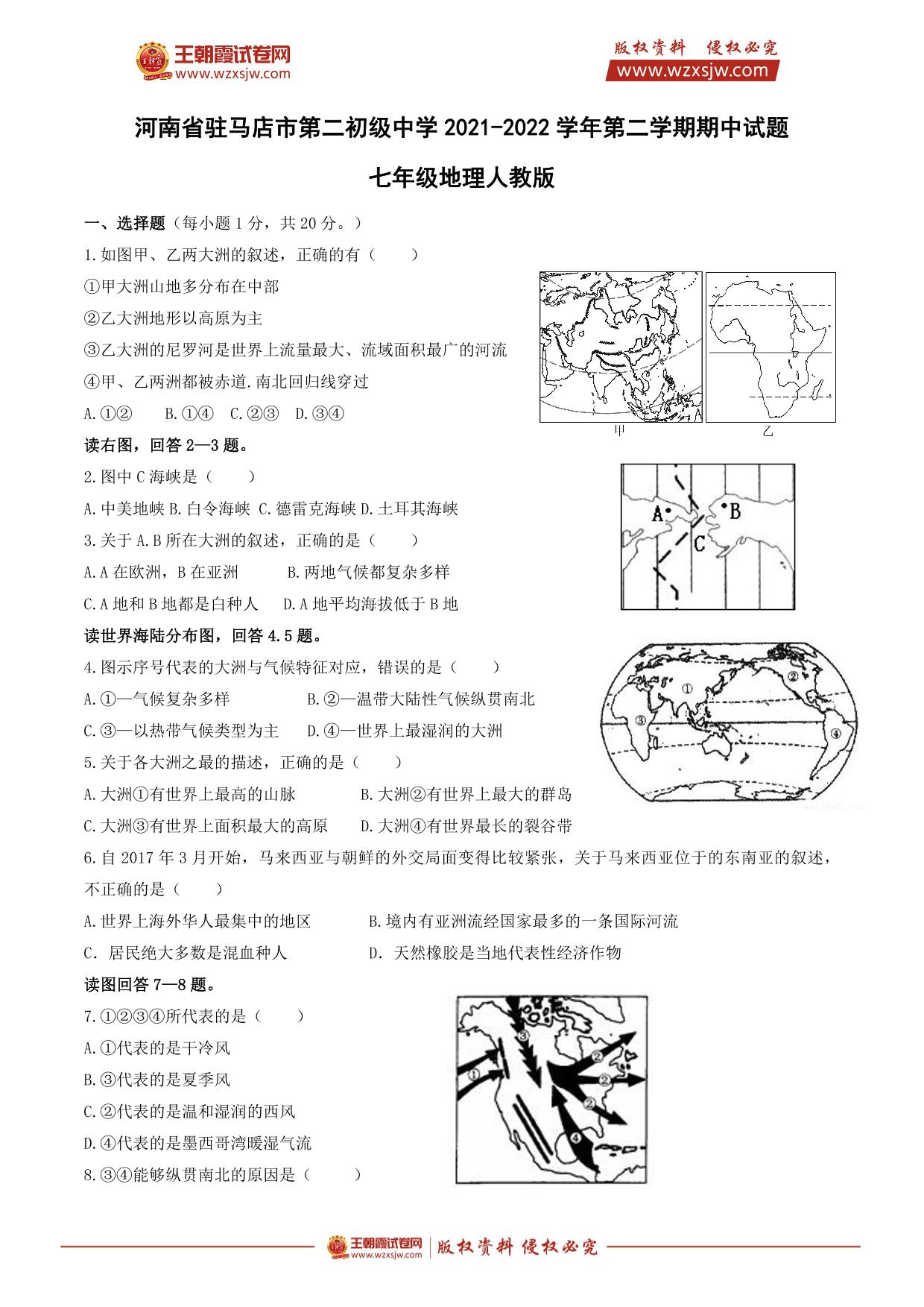 河南省驻马店市第二初级中学2021-2022学年第二学期期中试题七年级地理(人教版)