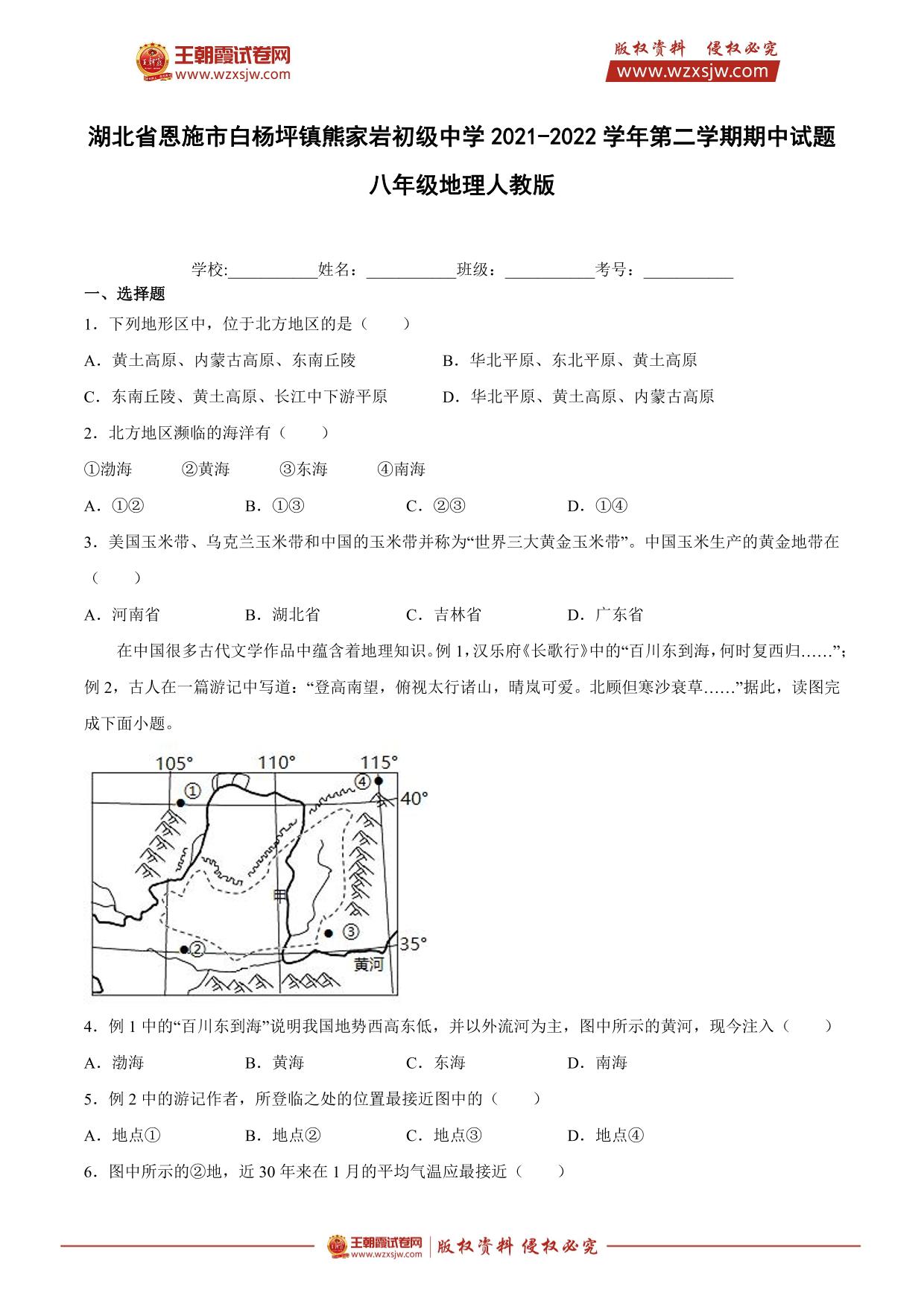 湖北省恩施市白杨坪镇熊家岩初级中学2021-2022学年第二学期期中考试试题八年级地理(人教版)