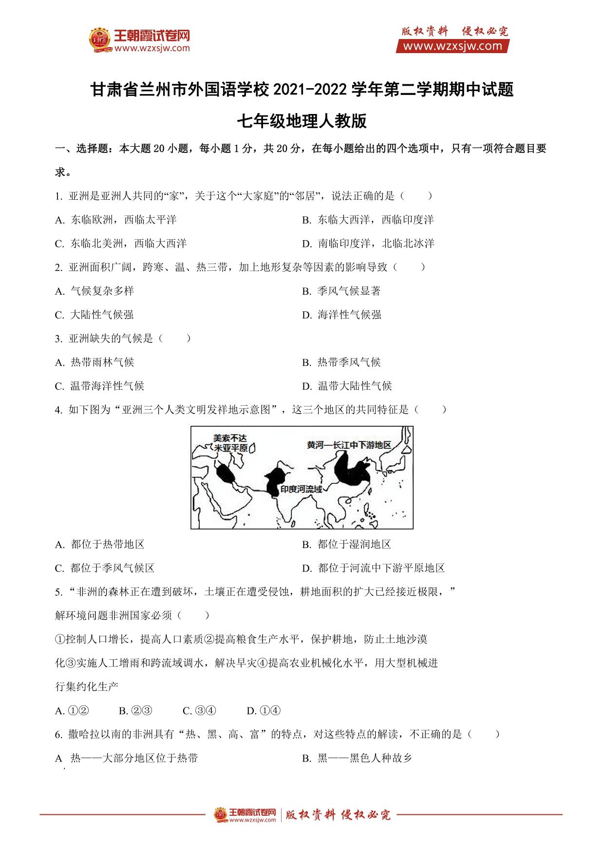 甘肃省兰州市外国语学校2021-2022学年第二学期期中试题七年级地理(人教版)