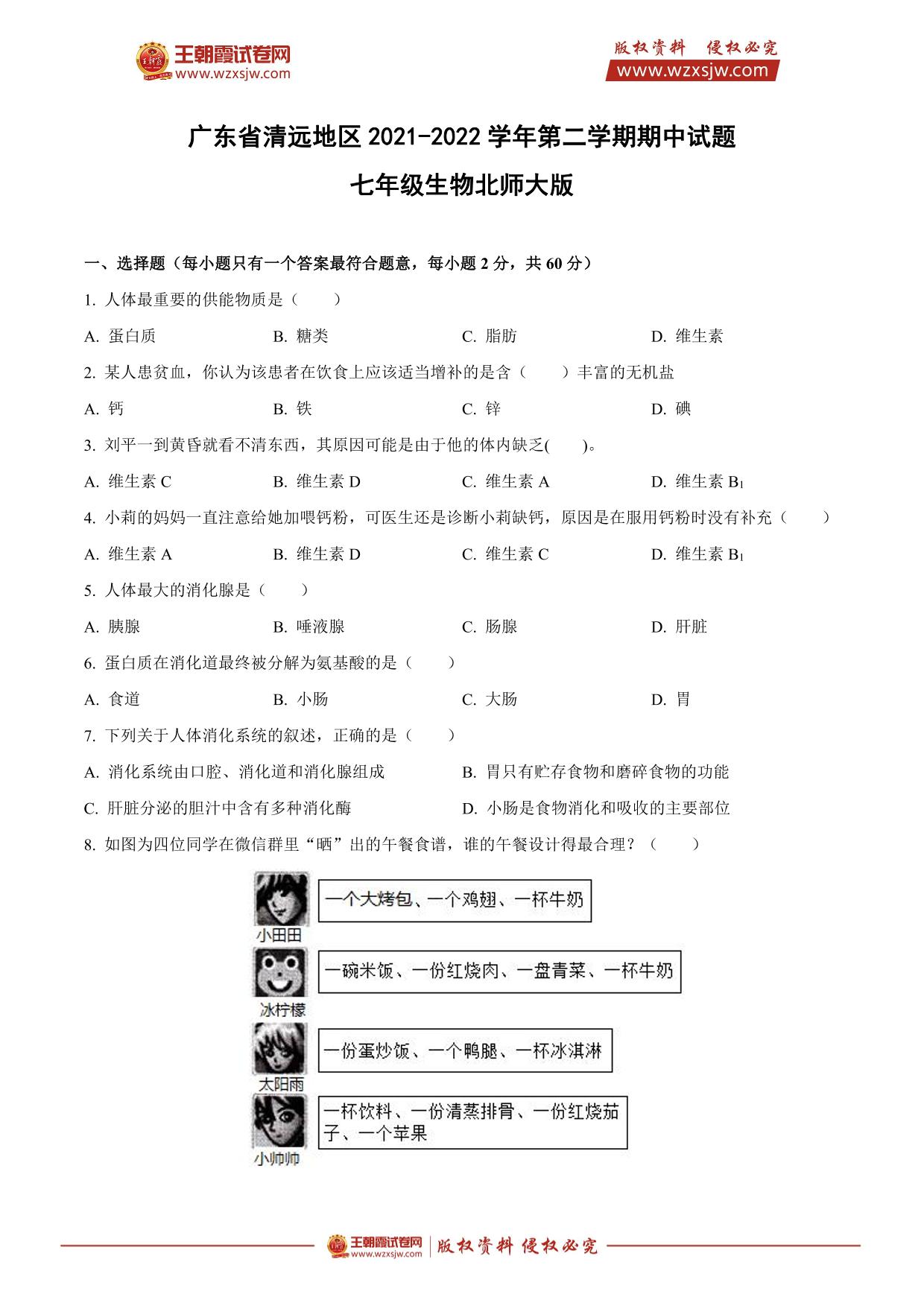 广东省清远地区2021-2022学年第二学期期中试题七年级生物(北师大版)