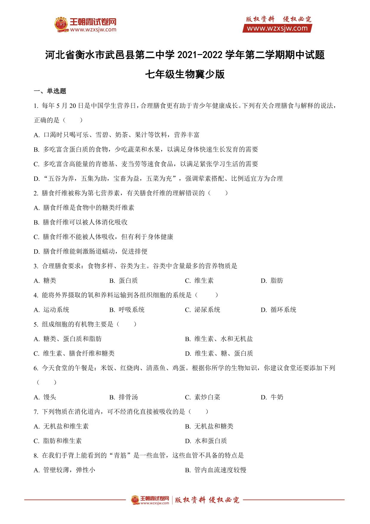 河北省衡水市武邑县第二中学2021-2022学年第二学期期中试题七年级生物(冀少版)