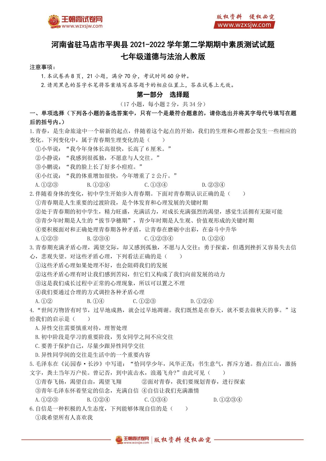 河南省驻马店市平舆县 2021-2022学年第二学期期中素质测试试题七年级道德与法治(人教版)