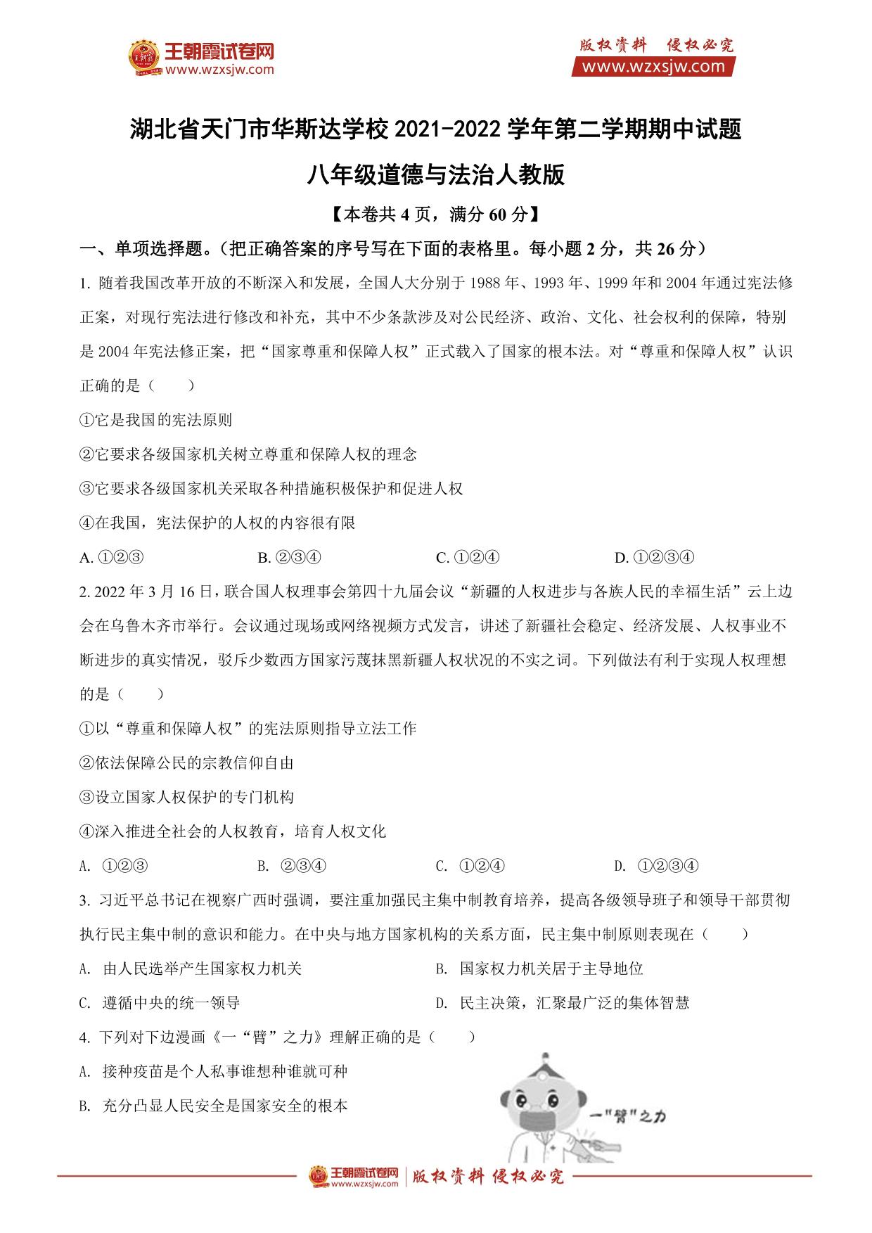 湖北省天门市华斯达学校2021-2022学年第二学期期中试题八年级道德与法治(人教版)