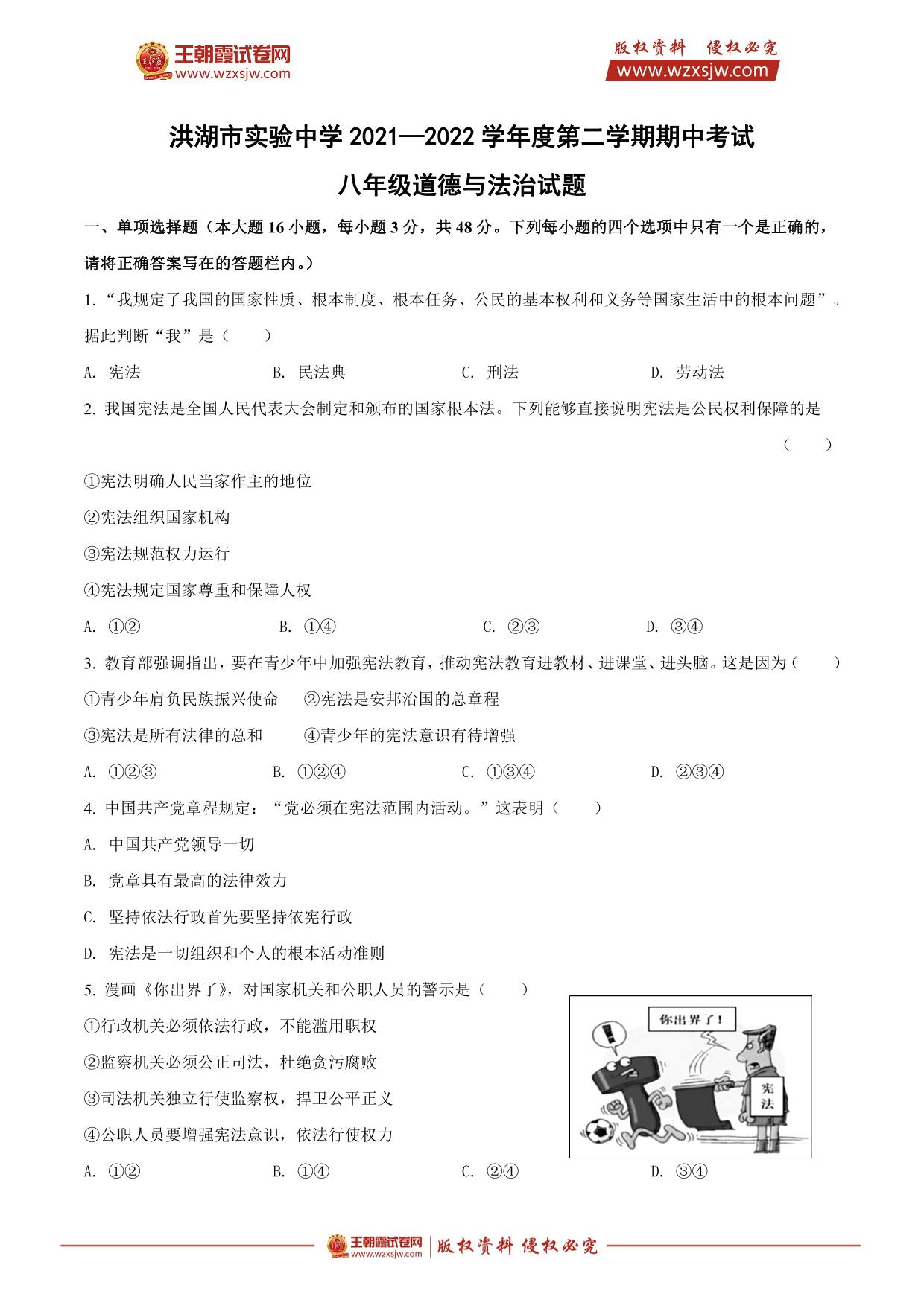 湖北省洪湖市实验初级中学2021-2022学年第二学期期中试题八年级道德与法治(人教版)