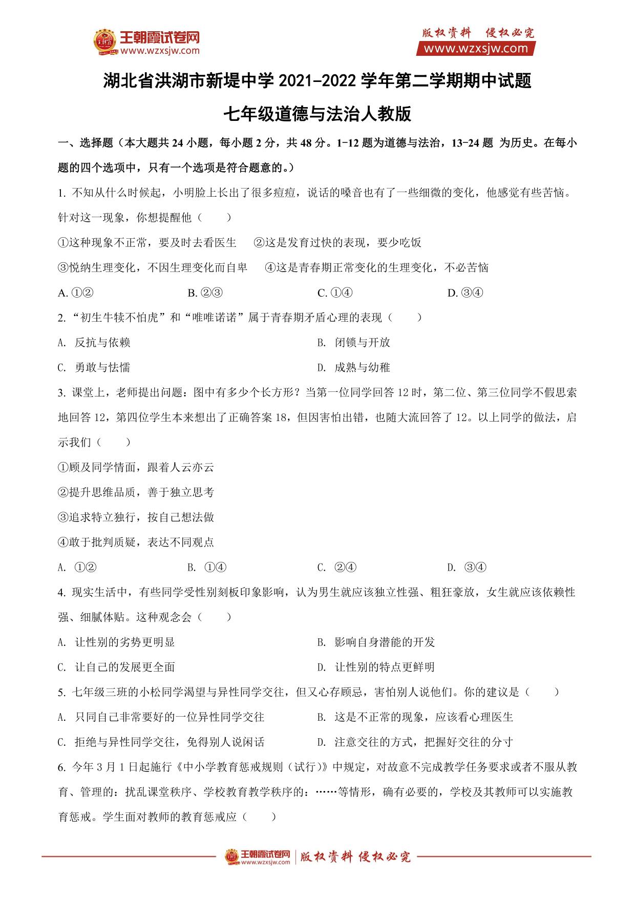 湖北省洪湖市新堤中学2021-2022学年第二学期期中试题七年级道德与法治(人教版)