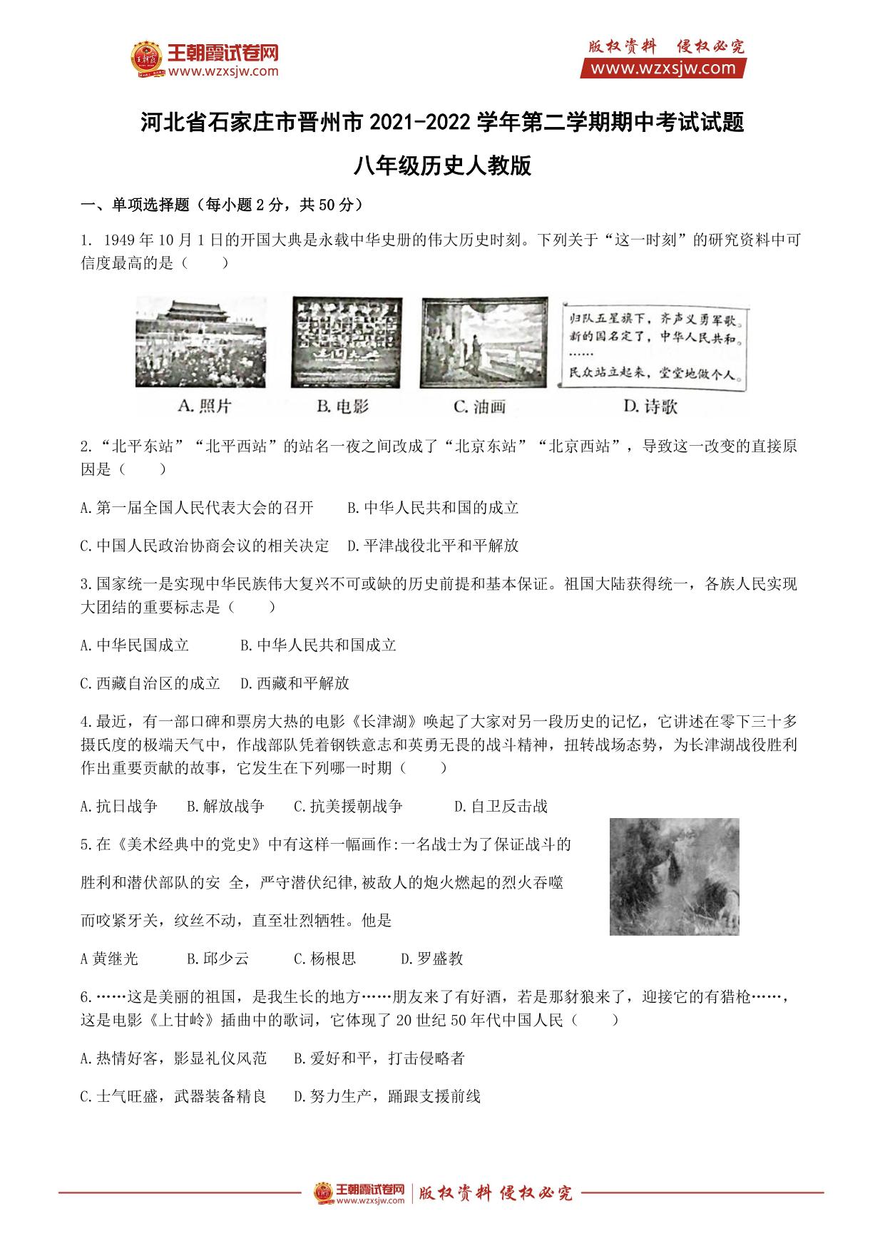 河北省石家庄市晋州市2021-2022学年第二学期期中考试试题八年级历史(人教版)