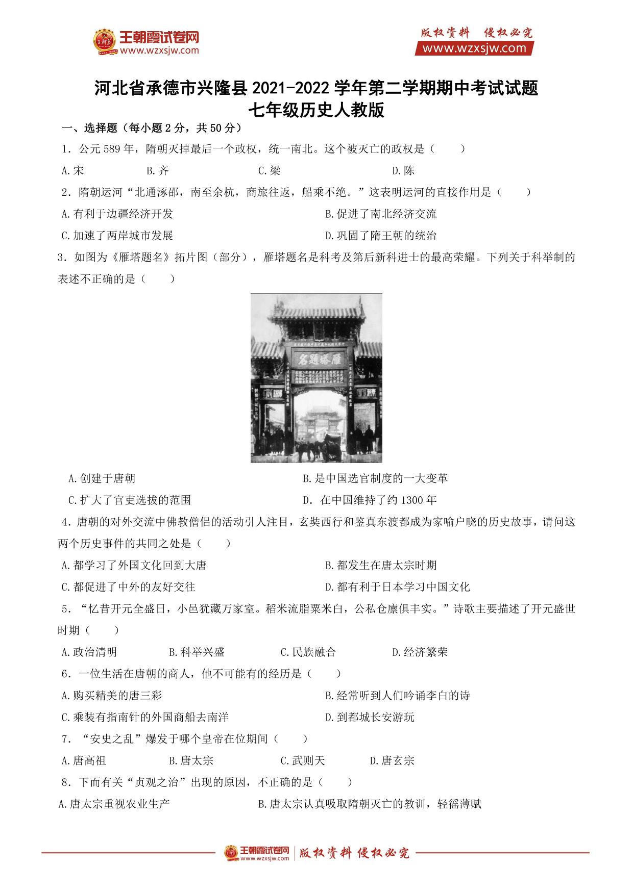 河北省承德市兴隆县2021-2022学年第二学期期中考试试题七年级历史(人教版)