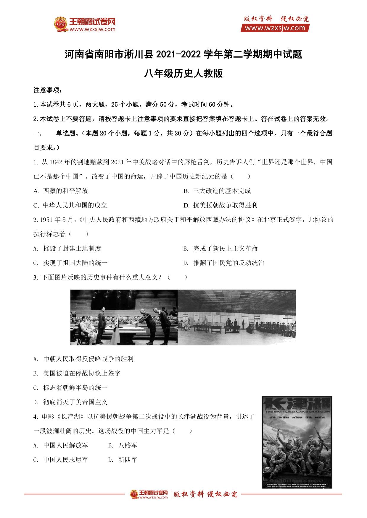 河南省南阳市淅川县2021-2022学年第二学期期中试题八年级历史(人教版)