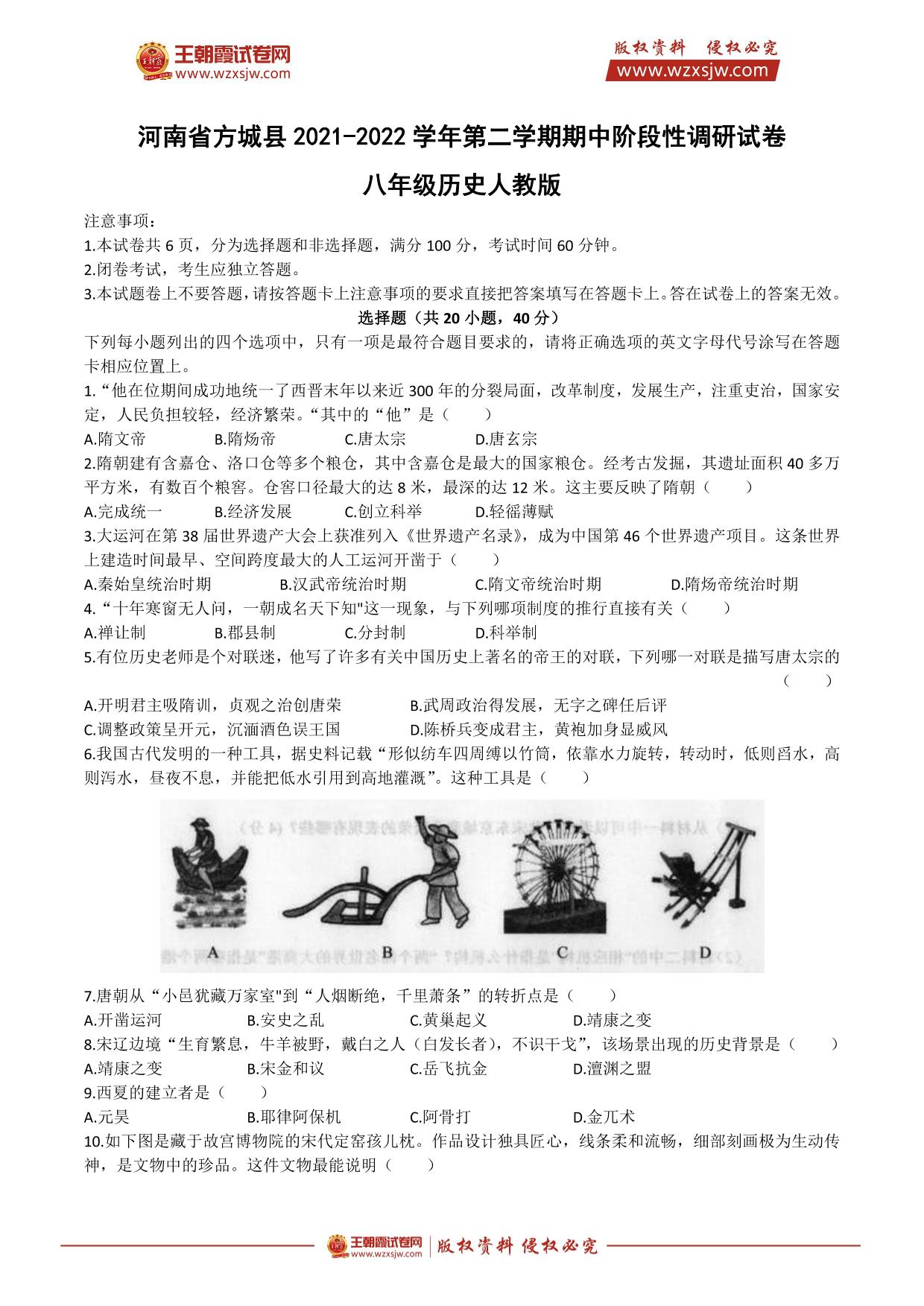 河南省方城县2021-2022学年第二学期期中阶段性调研试卷七年级历史(人教版)