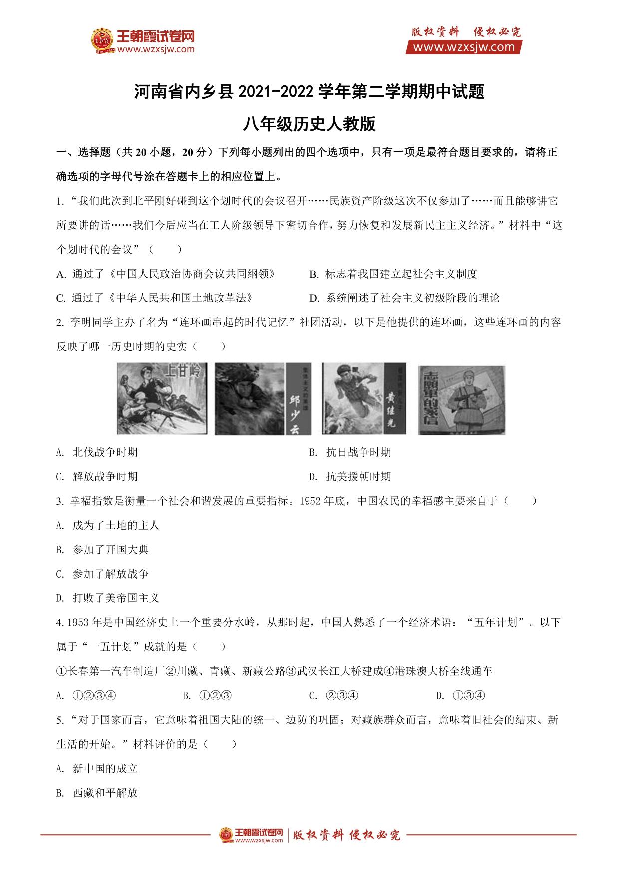 河南省内乡县2021-2022学年第二学期期中试题八年级历史(人教版)