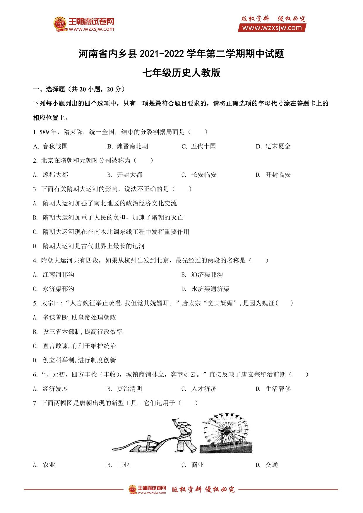 河南省内乡县2021-2022学年第二学期期中试题七年级历史(人教版)