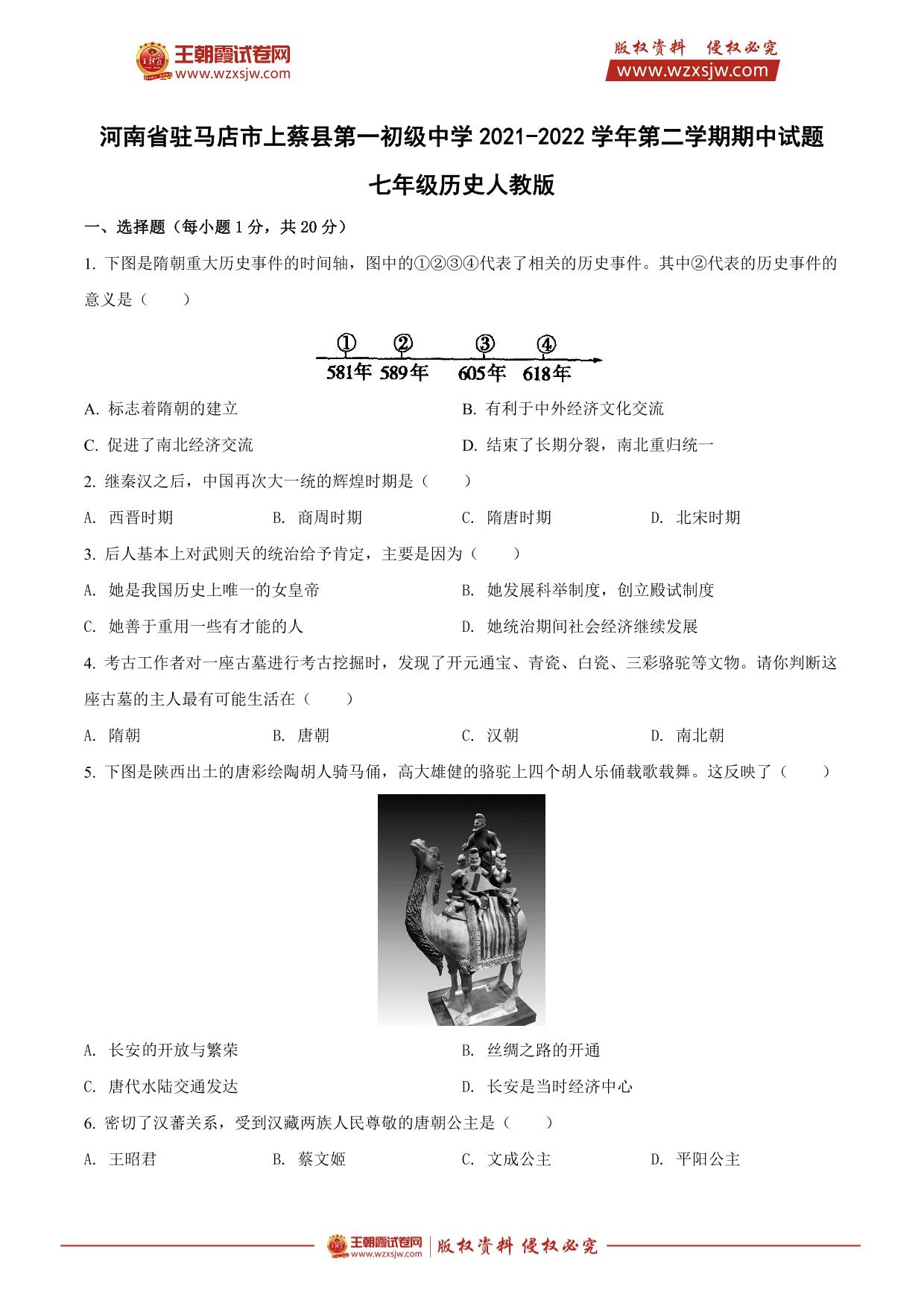河南省驻马店市上蔡县第一初级中学2021-2022学年第二学期期中试题七年级历史(人教版)