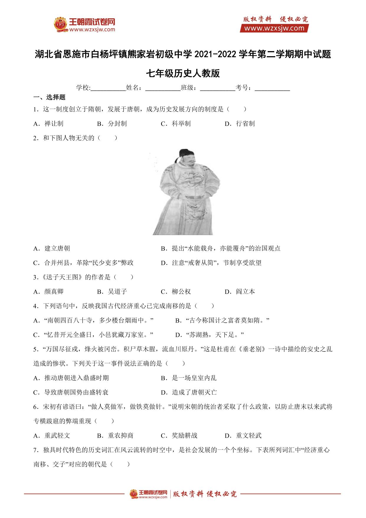 湖北省恩施市白杨坪镇熊家岩初级中学2021-2022学年第二学期期中考试试题七年级历史(人教版)