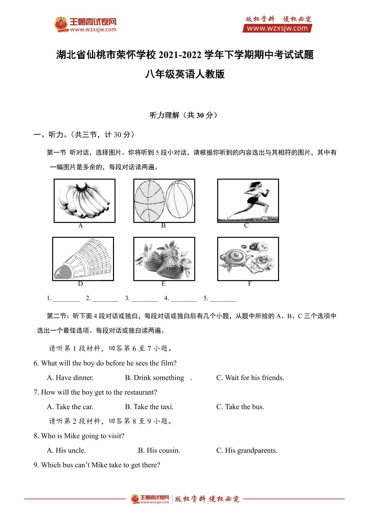 湖北省仙桃市荣怀学校2021-2022学年下学期期中考试试题八年级英语(人教版)【无听力音频】
