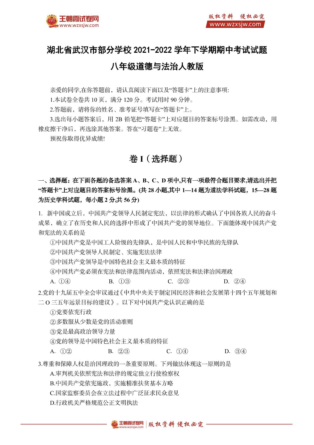 湖北省武汉市部分学校2021-2022学年下学期期中考试试题八年级道德与法治(人教版)