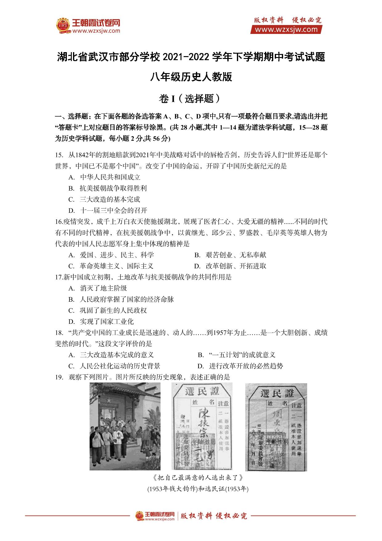 湖北省武汉市部分学校2021-2022学年下学期期中考试试题八年级历史(人教版)