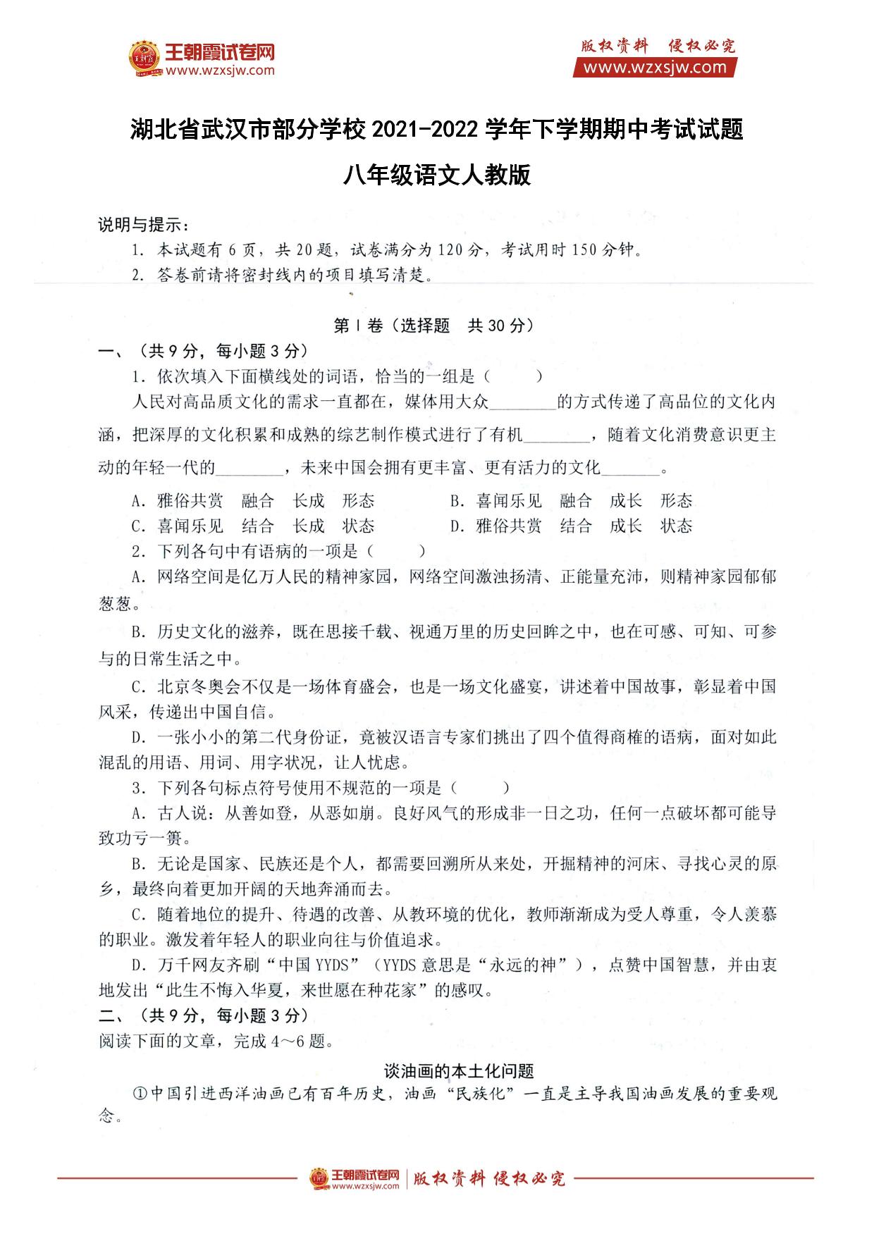 湖北省武汉市部分学校2021-2022学年下学期期中考试试题八年级语文(人教版)