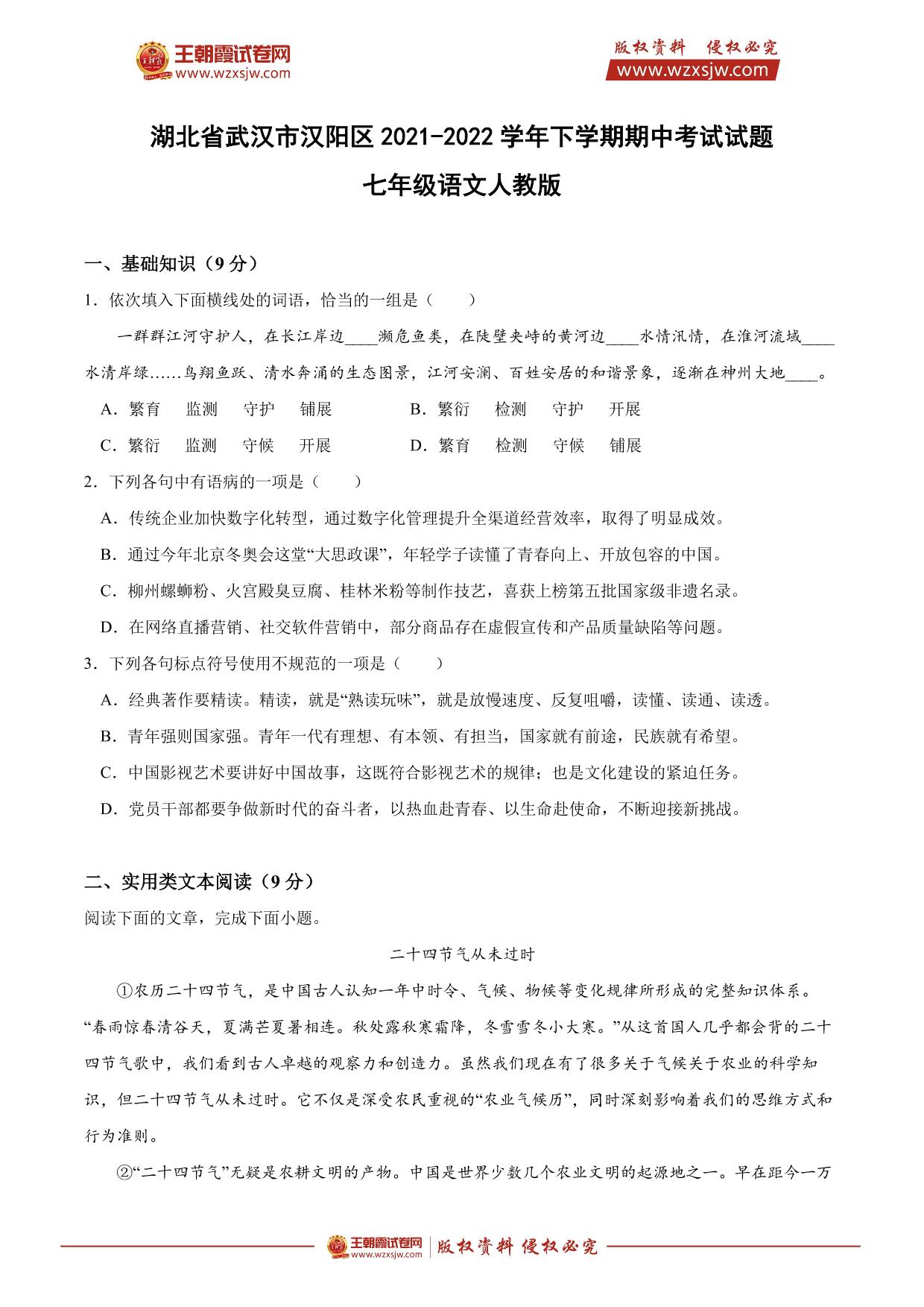 湖北省武汉市汉阳区2021-2022学年下学期期中考试试题七年级语文(人教版)