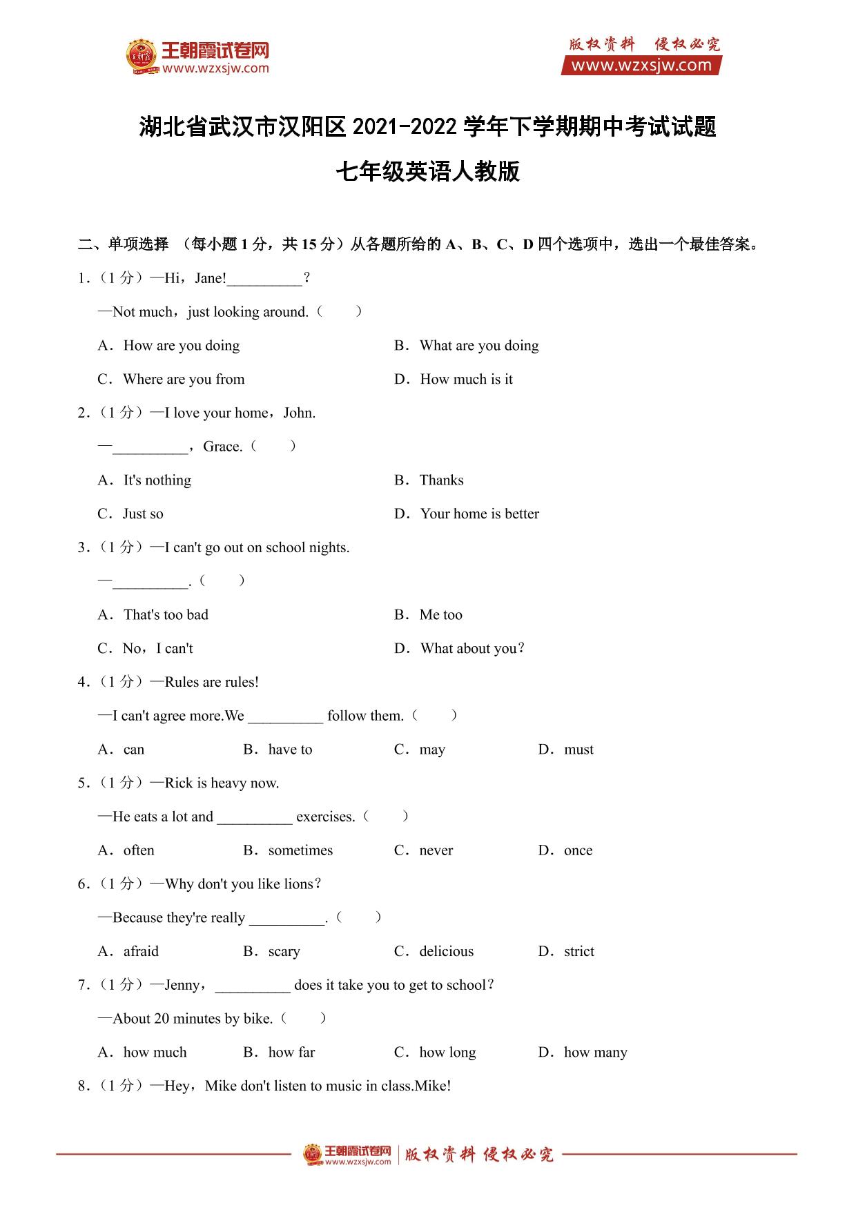 湖北省武汉市汉阳区2021-2022学年下学期期中考试试题七年级英语(人教版)【无听力音频】