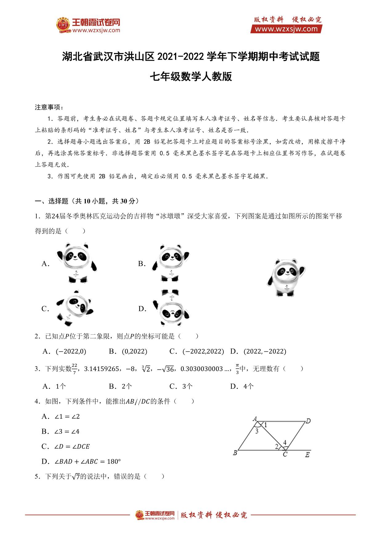 湖北省武汉市洪山区2021-2022学年下学期期中考试试题七年级数学(人教版)