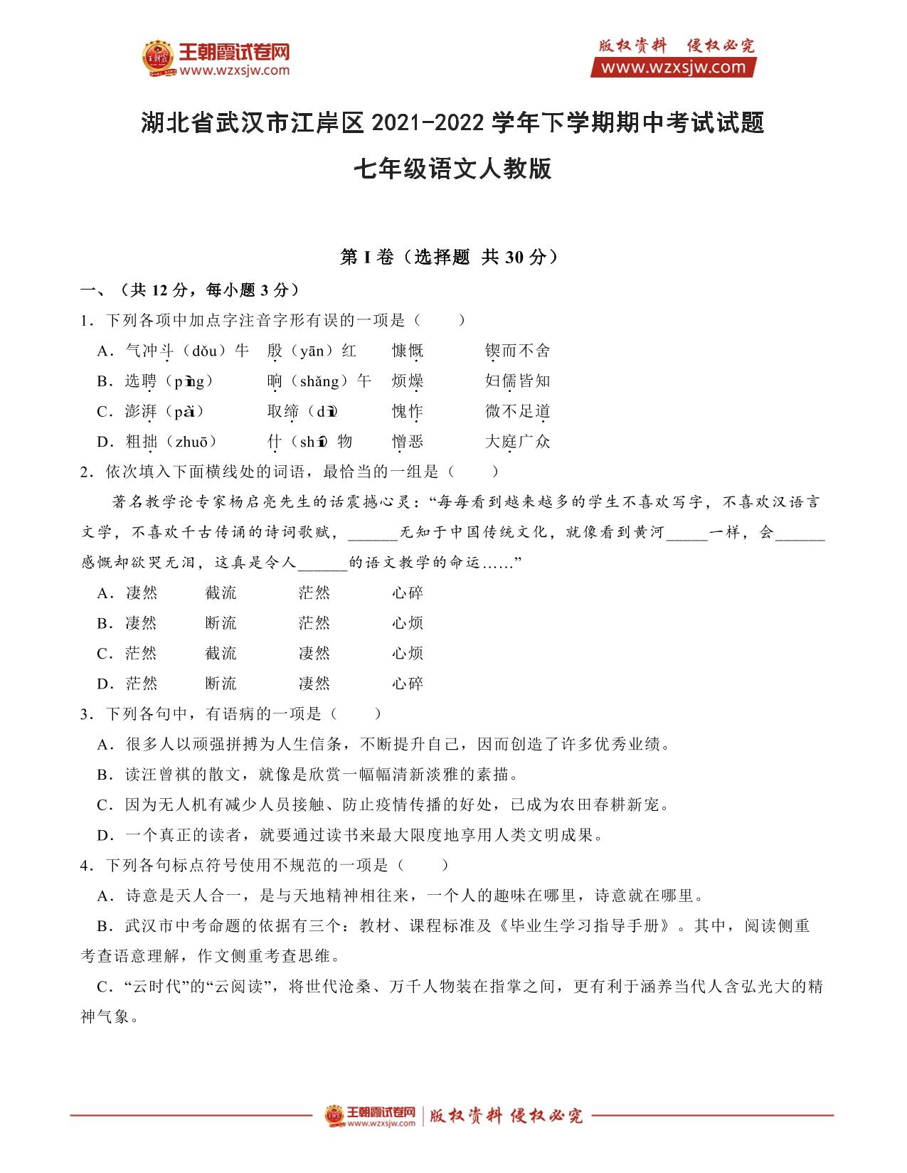 湖北省武汉市江岸区2021-2022学年下学期期中考试试题七年级语文(人教版)