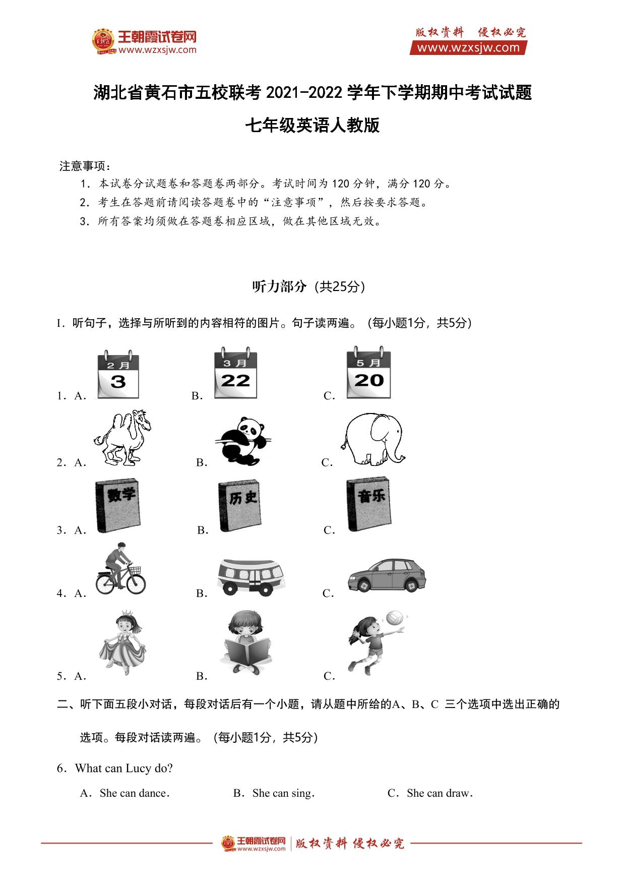 湖北省黄石市五校联考2021-2022学年下学期期中考试试题七年级英语(人教版)【无听力音频】