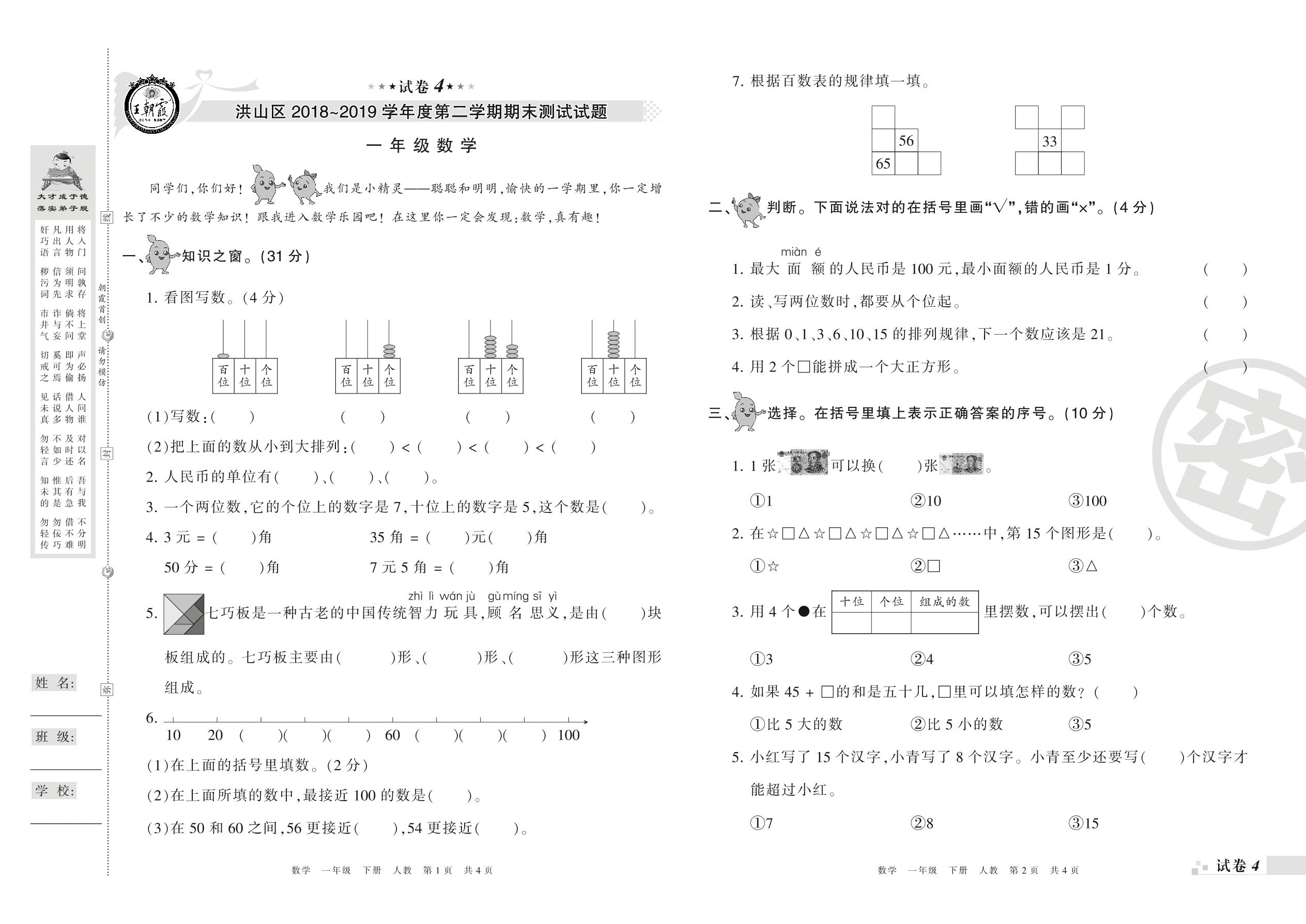 2018-2019学年第二学期武汉市洪山区一年级数学试卷(人教版)【4】
