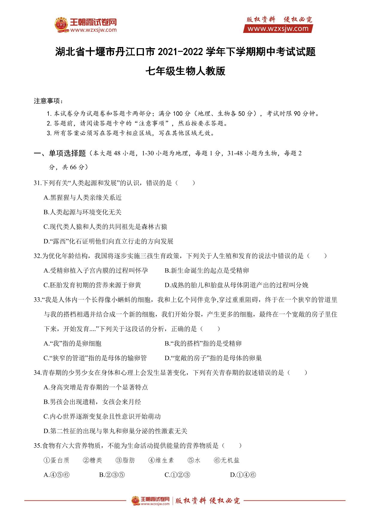 湖北省十堰市丹江口市2021-2022学年下学期期中考试试题七年级生物(人教版)