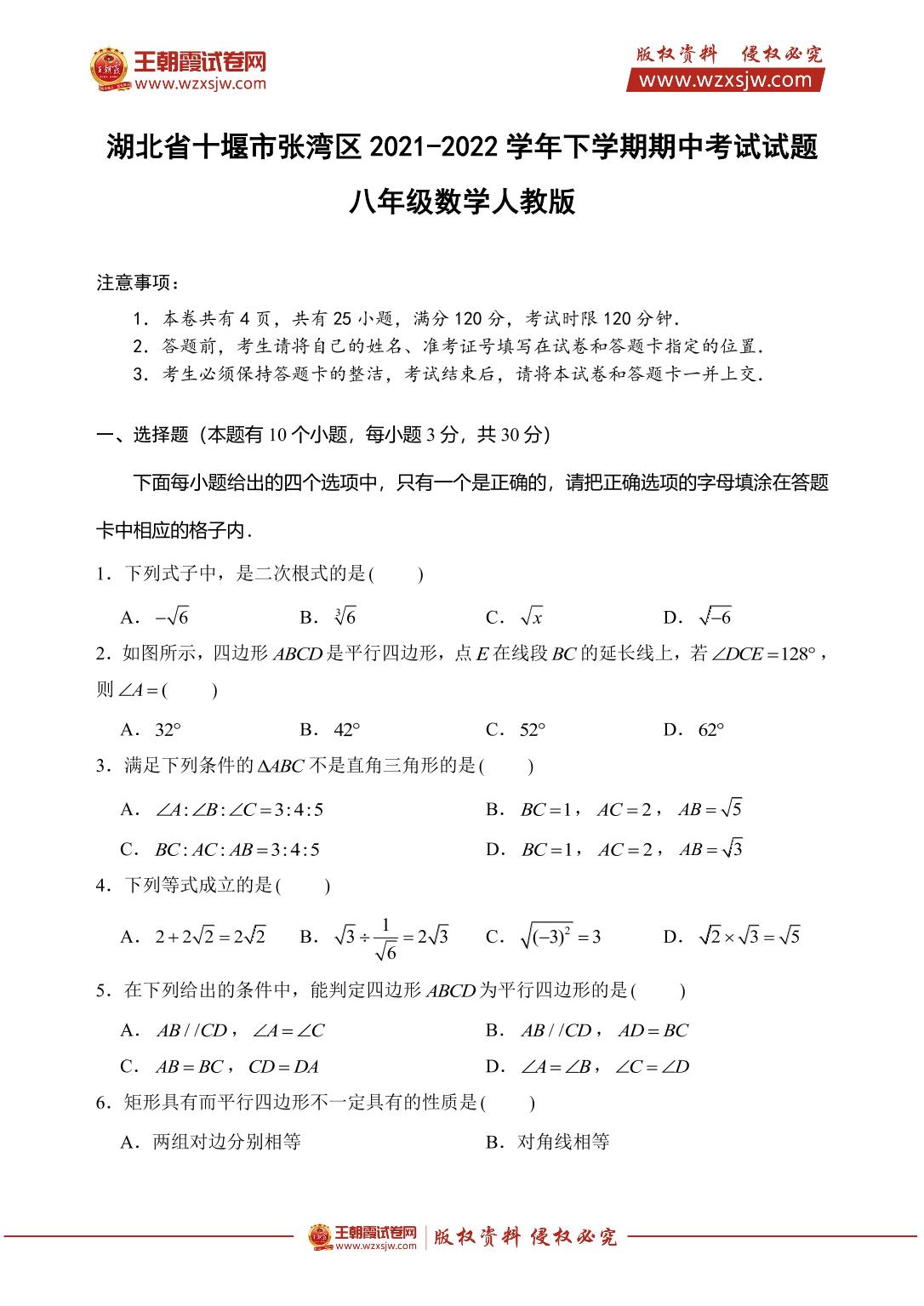 湖北省十堰市张湾区2021-2022学年下学期期中考试试题八年级数学(人教版)
