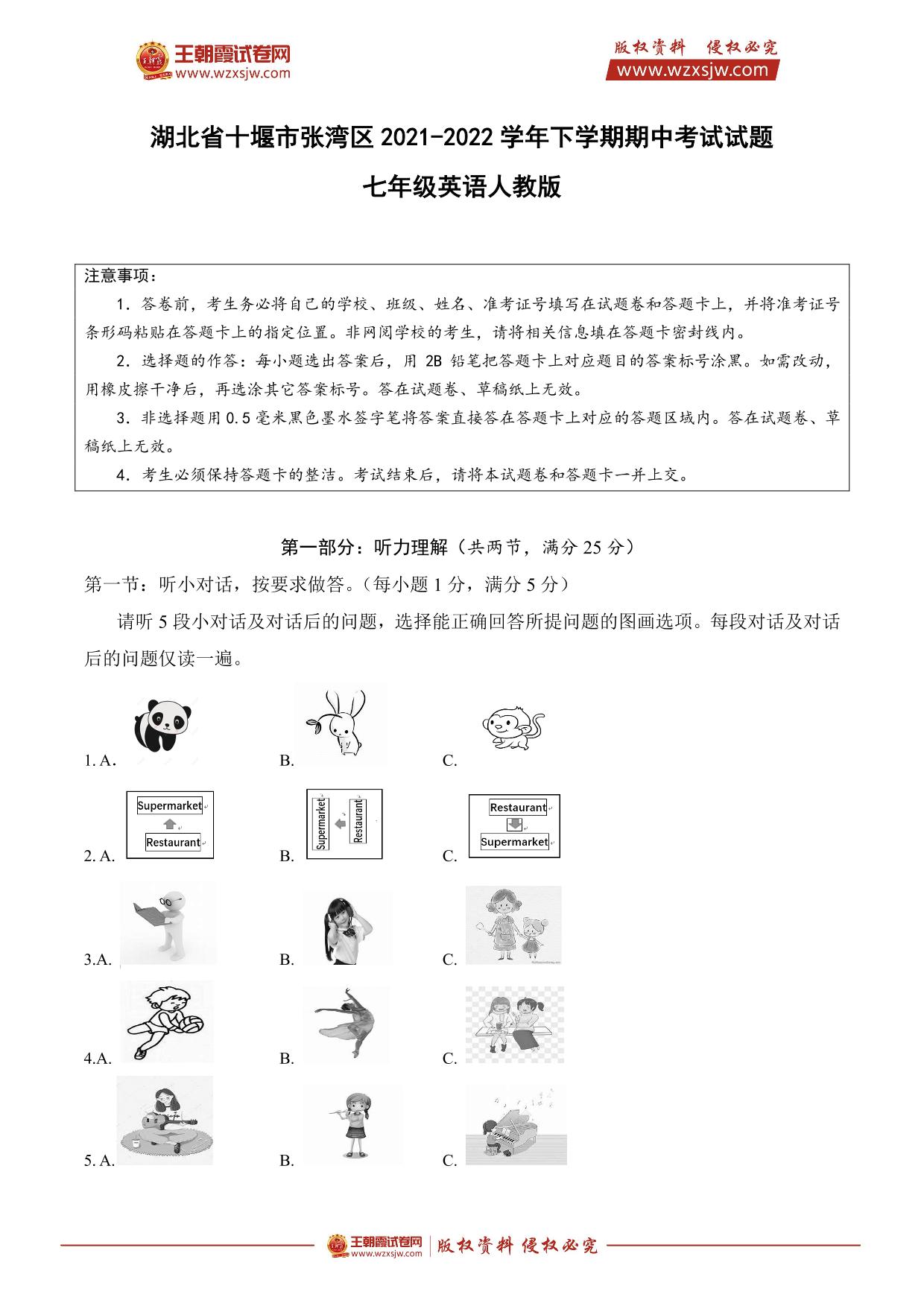 湖北省十堰市张湾区2021-2022学年下学期期中考试试题七年级英语(人教版)【无听力音频】