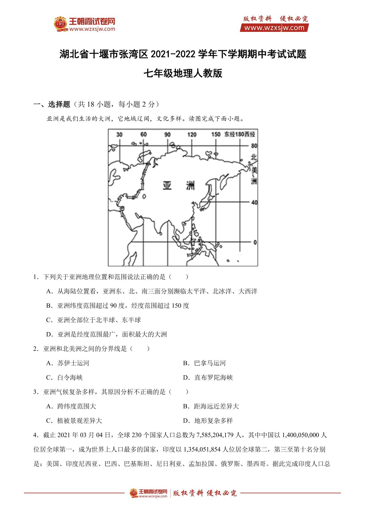 湖北省十堰市张湾区2021-2022学年下学期期中考试试题七年级地理(人教版)