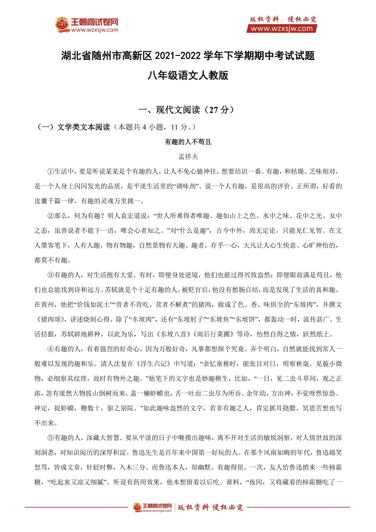 湖北省随州市高新区2021-2022学年下学期期中考试试题八年级语文(人教版)
